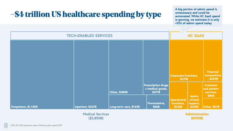 While both cohorts of businesses are equally represented in this work, it’s worth noting that tech-enabled services are much more prevalent in the healthcare industry, representing approximately 70% of unicorns to-date and 80% of the public exits in the last five years. This is for good reason. Of the $4 trillion spent on healthcare in 2021, we estimate that three-quarters of that is the cost of delivering care and thus directly addressable by tech-enabled services businesses. A quarter of the total healthcare spend is attributed to administrative costs, of which today only about 10% is technology and software spend. While SaaS spend in healthcare is growing quickly, we are still in the early stages of digitization, leaving room for automation and reduction of administrative spend.