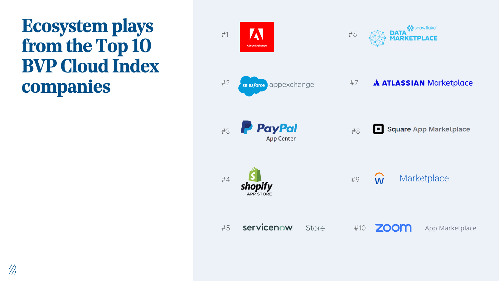 This cloud business lesson has come to life time and time again — so much so that the top ten companies on the BVP Cloud Index by market capitalization have all implemented this ecosystem strategy.