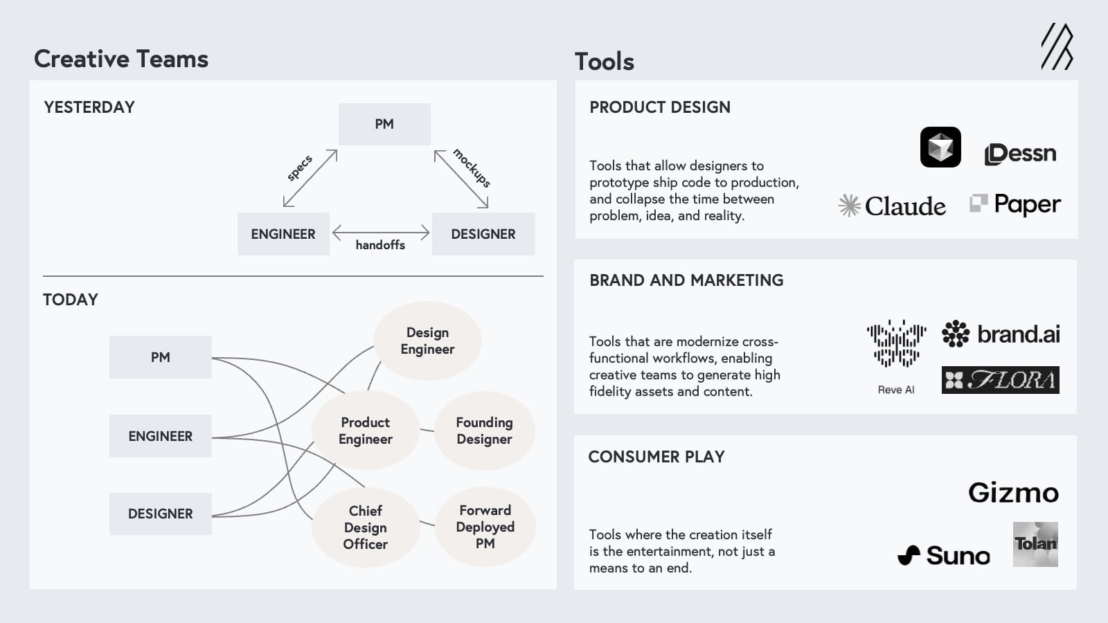 This is just the beginning of our evolving thesis on an emerging creative tech stack. In that spirit, we’ll be doing a three-part deep dive into product design, brand and marketing, and consumer play. We’ll explore how the best teams are working, which tools actually matter, and why creative conviction remains an overlooked moat in a world where everyone has access to the same models.