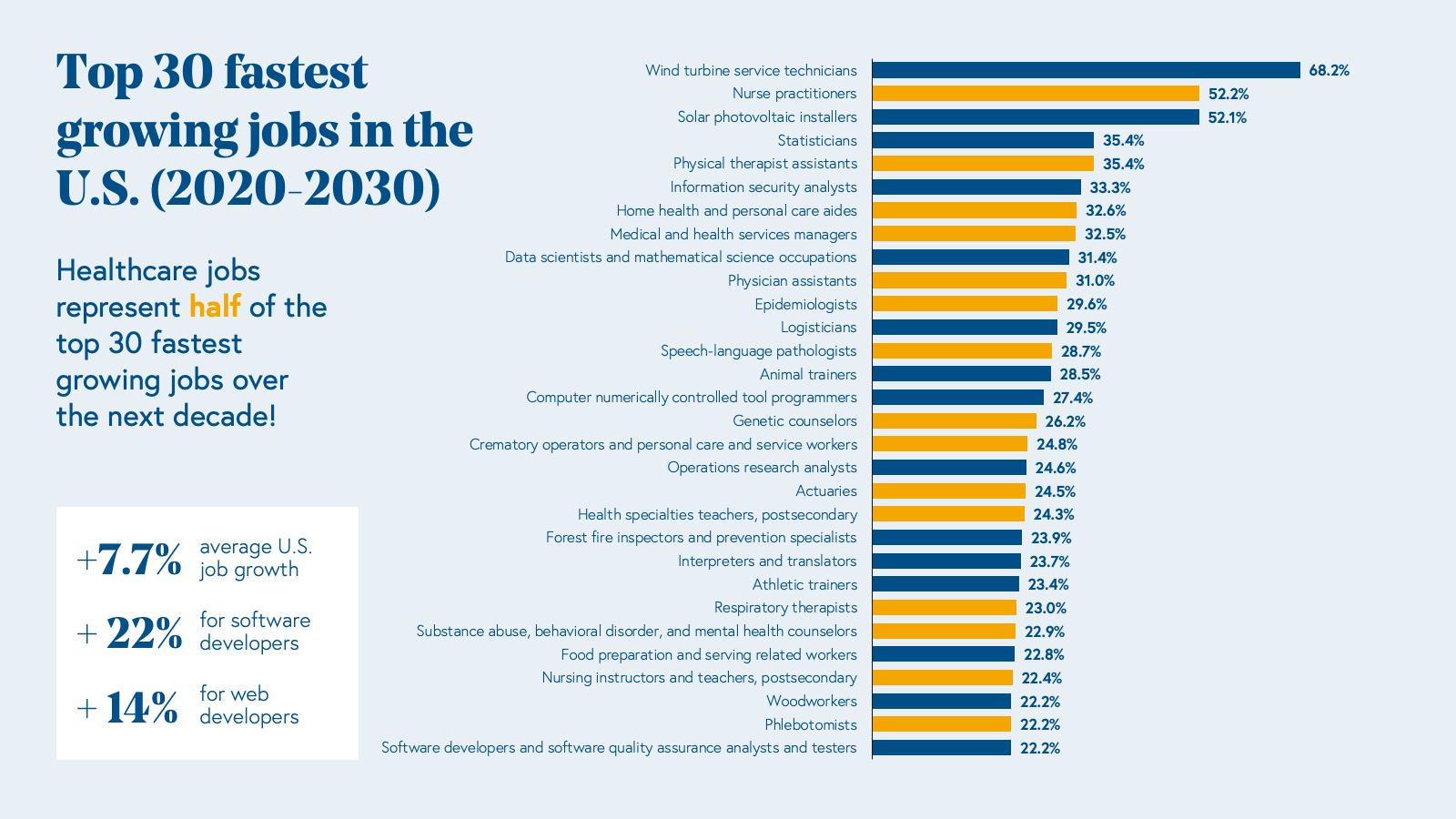 Selling bottoms-up to healthcare and life sciences represents a massive total addressable market (TAM). A whopping 14% of the US workforce works in healthcare: 1 in 7 American workers, or 22 million people, and healthcare jobs represent half of the top 30 fastest growing jobs in the US over the next decade.