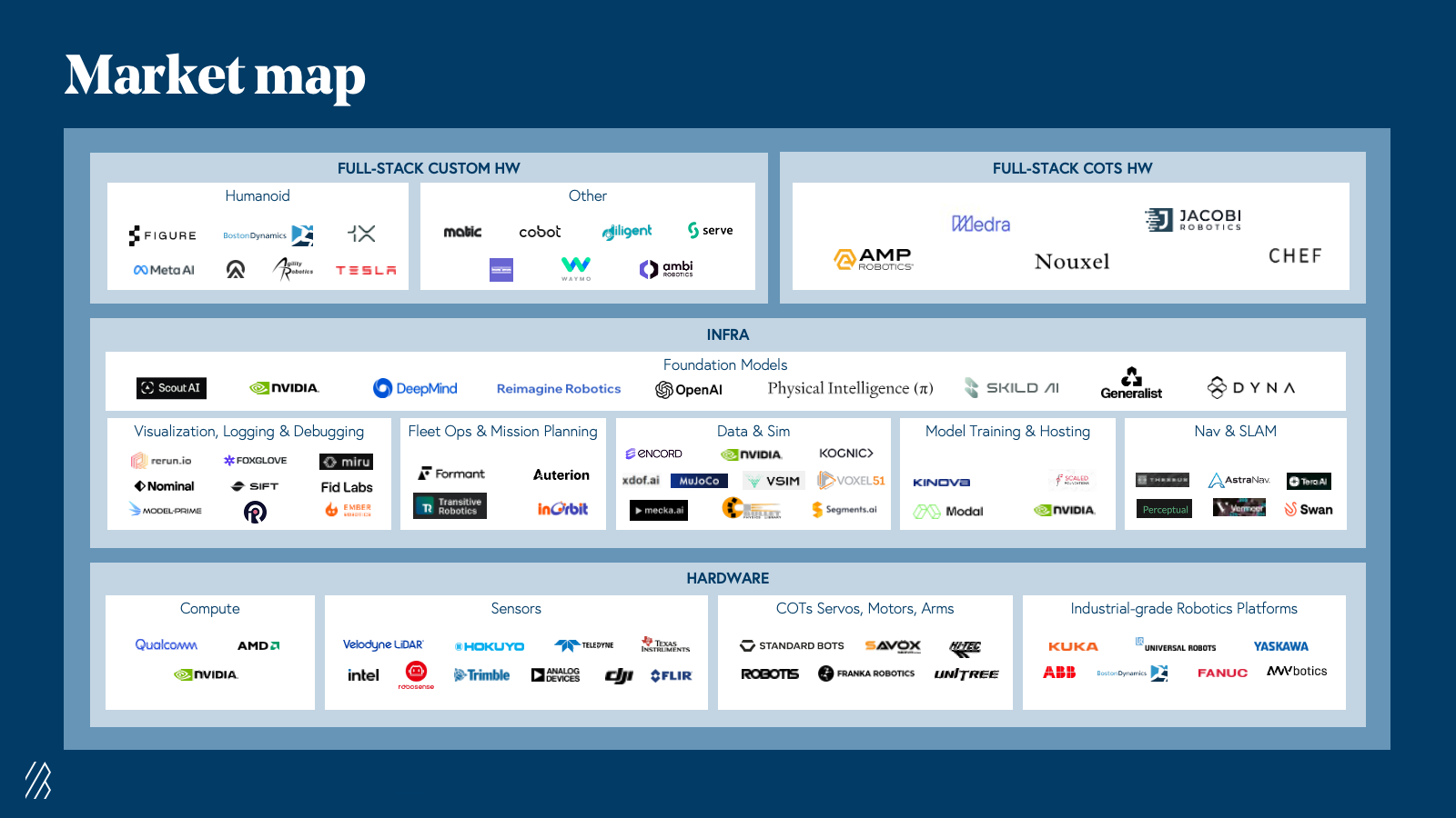 - The emerging robotics ecosystem comprises commoditized hardware, democratized AI capabilities through foundation models, and critical infrastructure layers such as logging, simulation, and visualization platforms to support development.