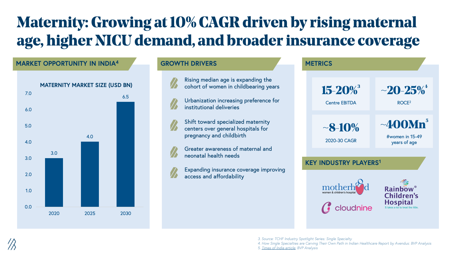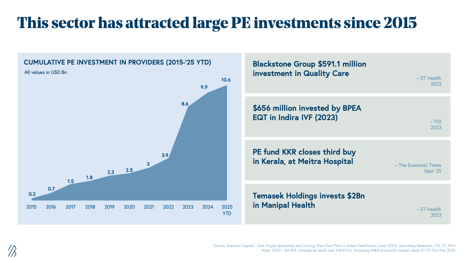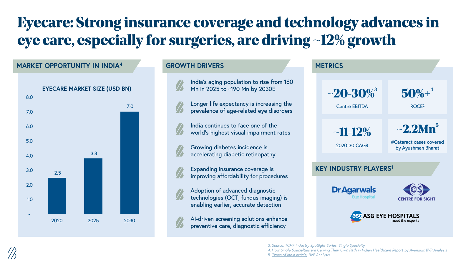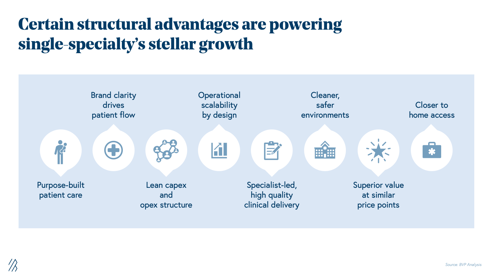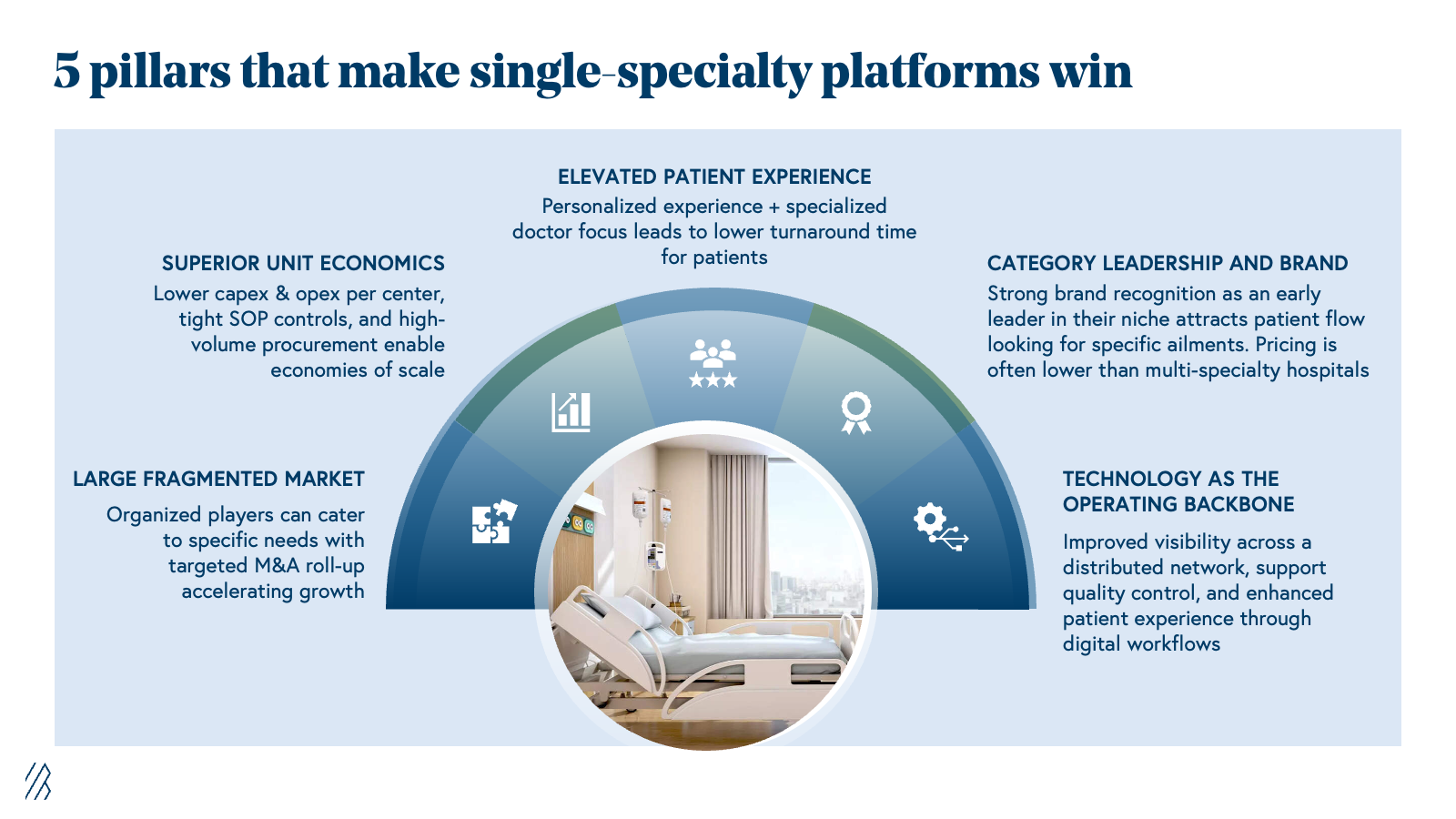 We expect single-specialty healthcare providers to expand at nearly 2x the pace of multi-specialty hospitals1. Several structural advantages, including purpose-built specialization, explain this outperformance. While multi-specialty hospitals spread capital across equipment usable in multiple departments, single-specialty centers invest in highly specialized tools tailored to one area of care, whether ophthalmic lasers, IVF labs, or dialysis stations, enabling superior precision and outcomes.