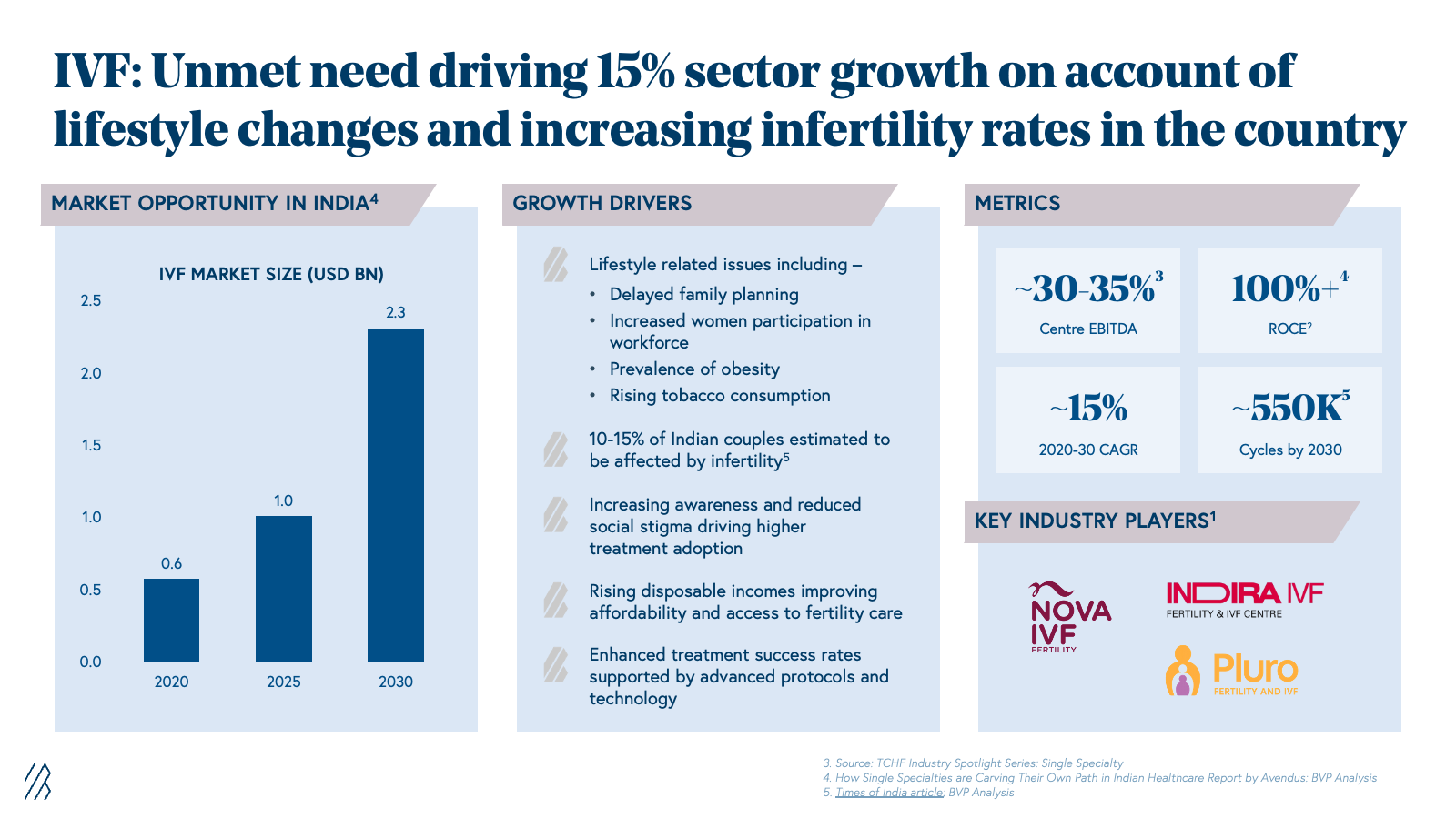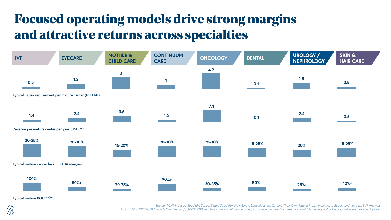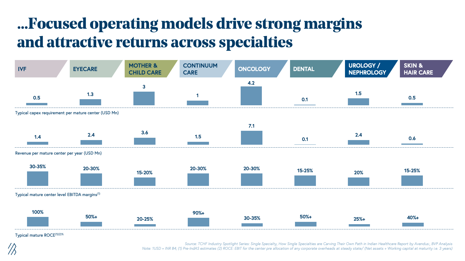 Streamlined SOPs, predictable patient volumes, and customizable capacity planning make replication across cities or clusters faster and capital-light, ideal for Tier 2 and Tier 3 market expansion. For instance, Pluro Fertility and IVF is an M&A roll-up platform consolidating single doctor-led fertility clinics across India. The company has built a comprehensive post-merger integration playbook covering standardized clinical SOPs, centralized IT and financial systems, unified branding, and procurement efficiencies that are being deployed rapidly at each acquired clinic. By retaining founder-doctors as clinical leads while layering in operational infrastructure, Pluro demonstrates how templated integration processes and regional density can enable efficient scaling across underserved markets. Single-specialty operations are well-positioned to scale thanks to their ability to deliver more focused and intentional care. For example: