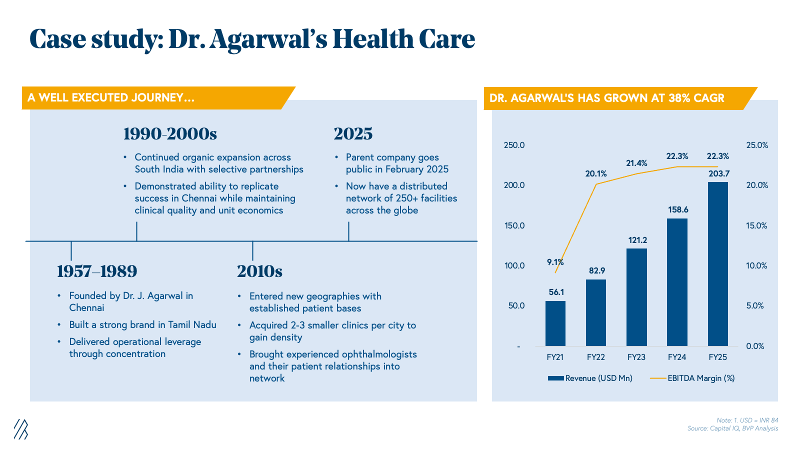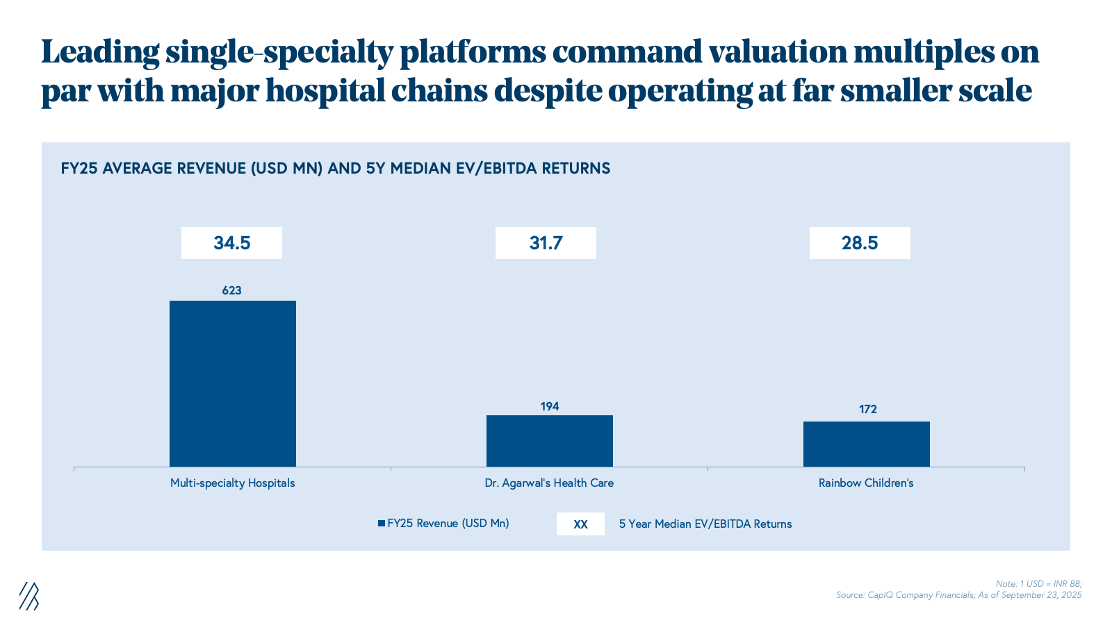 Single specialty providers are positioned to command even more attractive valuations given their superior unit economics. For instance, Dr. Agarwal's Eye Hospital, despite being significantly smaller (FY25 revenue of ~$194M) in scale compared to leading hospital chains like Apollo Hospitals (FY25 revenue of ~$2.5B) or Max Healthcare (FY25 revenue of ~$799M)1, trades at comparable multiples. This valuation parity, despite the relatively smaller scale, validates that investors value the quality of earnings and business model characteristics — high margins, capital efficiency, predictable growth, and category leadership — over absolute revenue size.