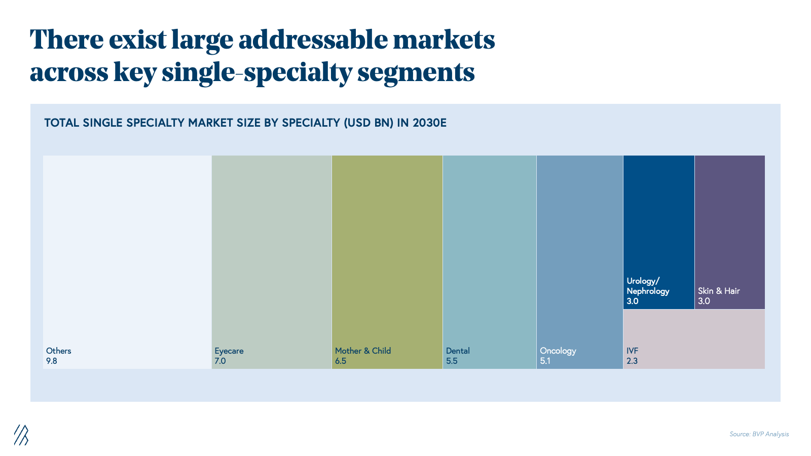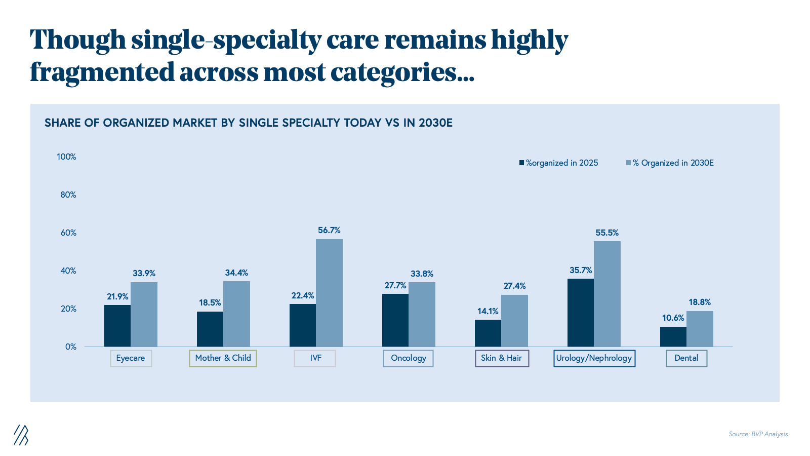 - The current landscape presents a compelling opportunity for entrepreneurial founders, as most single-specialty verticals remain highly fragmented. Even by 2030, most categories, such as eyecare, oncology, and dental, are unlikely to be even 60% organized. This fragmentation creates a significant opening for visionary founders to establish credible brands, set industry standards, and effectively become category creators in their chosen vertical.