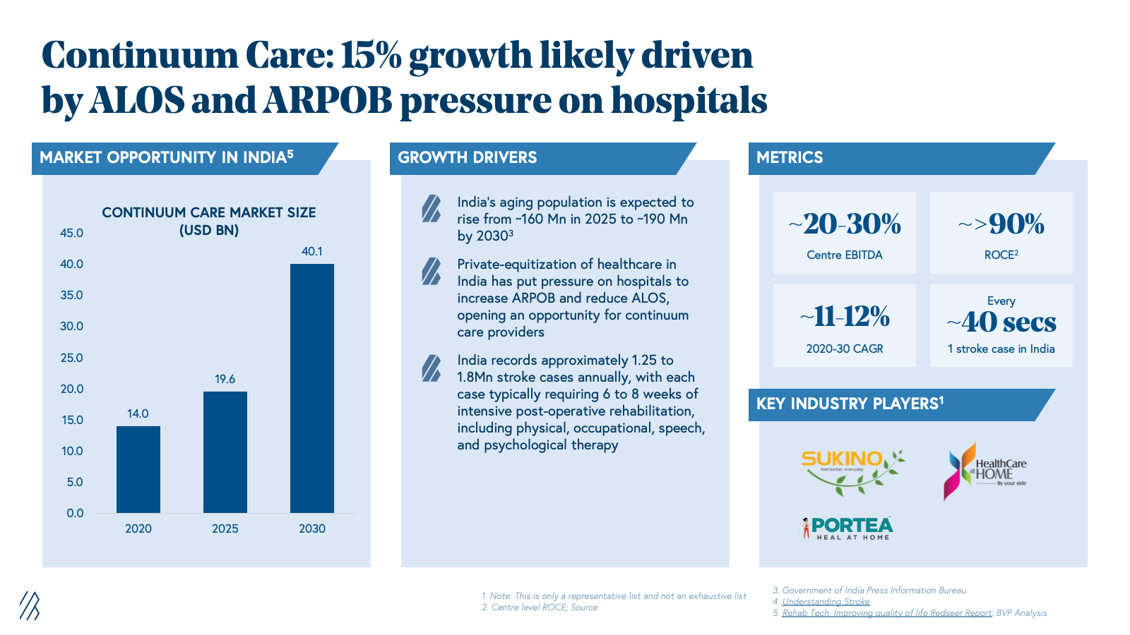 - Specialization expands the healthcare opportunity: Demographics (a 3.4% annual growth in the population aged 60+), rising insurance penetration, and sustained investor interest are accelerating the growth of single-speciality providers. By 2030, India’s single-specialty market (organized and unorganized) is poised to exceed $40B, led by operators achieving superior outcomes, differentiated patient experience, and attractive unit economics - with 12–18 month payback and sustainable 20%+ EBITDA margins.