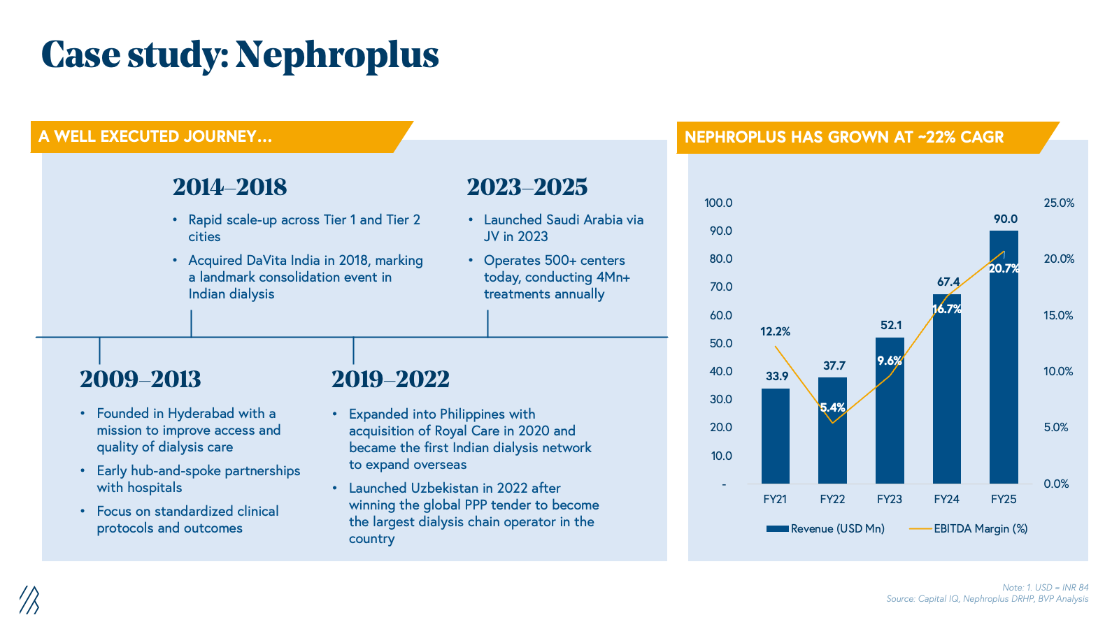 Outcomes are also shaped by the complexity of operations and doctor dependencies. Highly physician-dependent areas, such as complex oncology, lend themselves to slower, expertise-led, M&A-driven expansion. On the other hand, protocol-driven areas such as dialysis can scale rapidly via standardized training, systems, and multi-center rollouts.