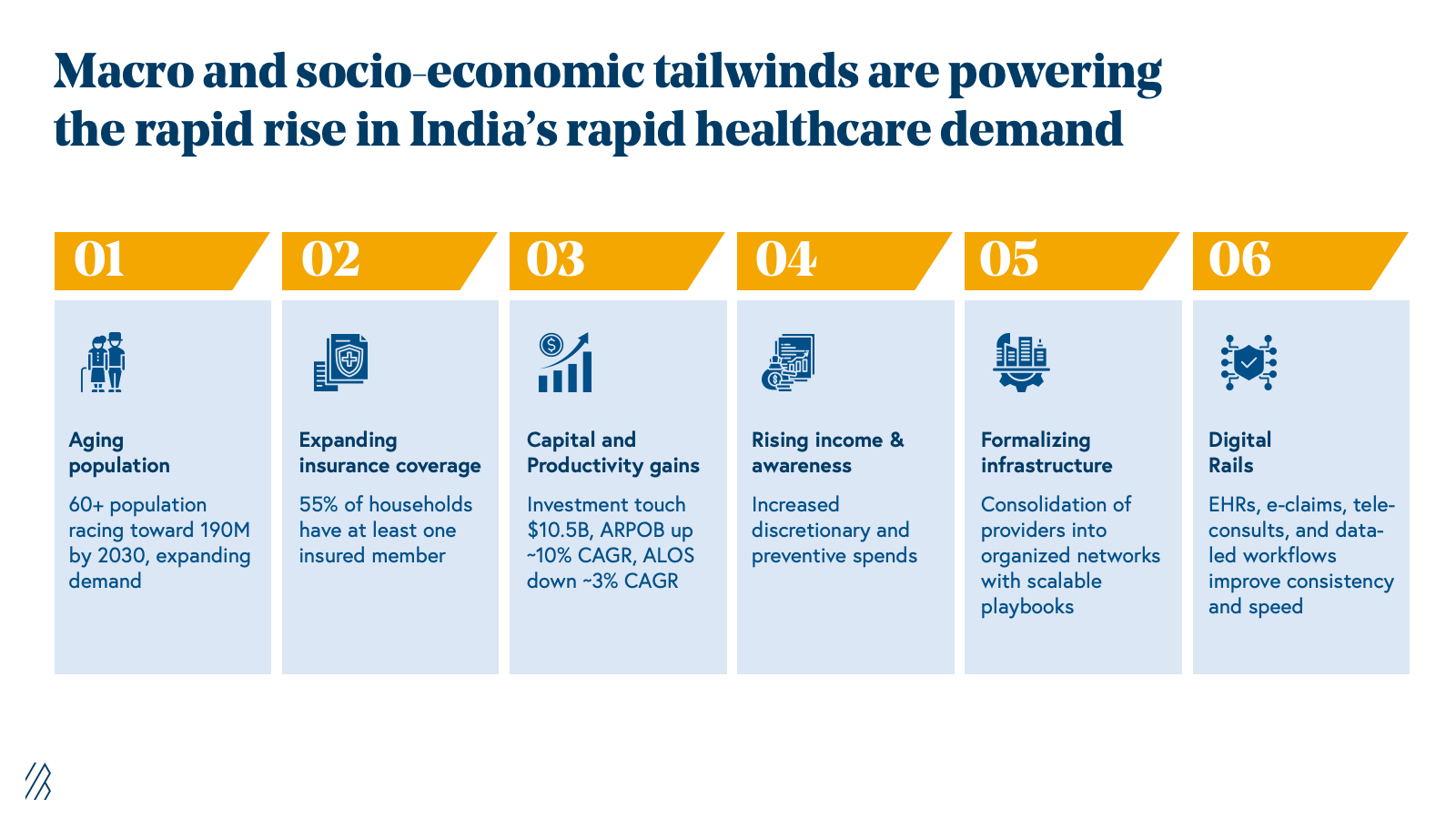 India’s provider market is expected to grow from roughly $54 billion in 2025 to about $95 billion by 2030, growing at approximately 11% CAGR. Powerful demographic, financial, and structural shifts underpin this expansion: