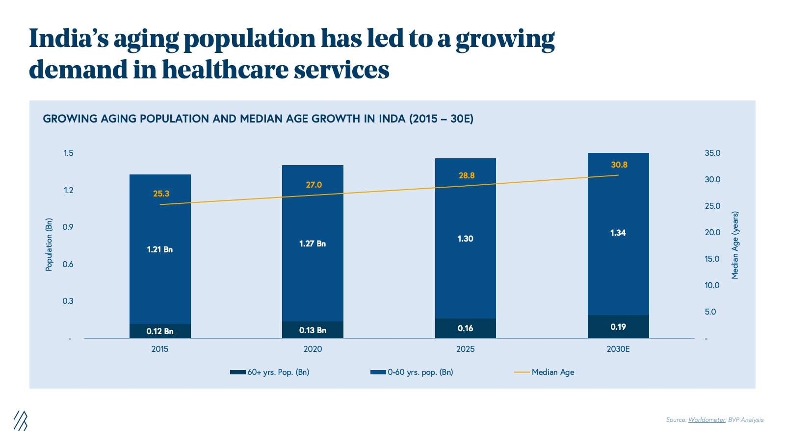 - Demographic tailwinds: The 60+ population is projected to rise from about 160 million in 2025 to nearly 190 million by 2030, sharply increasing demand for chronic and age-related care services. This aging cohort is driving sustained utilization of both acute and long-term care infrastructure.