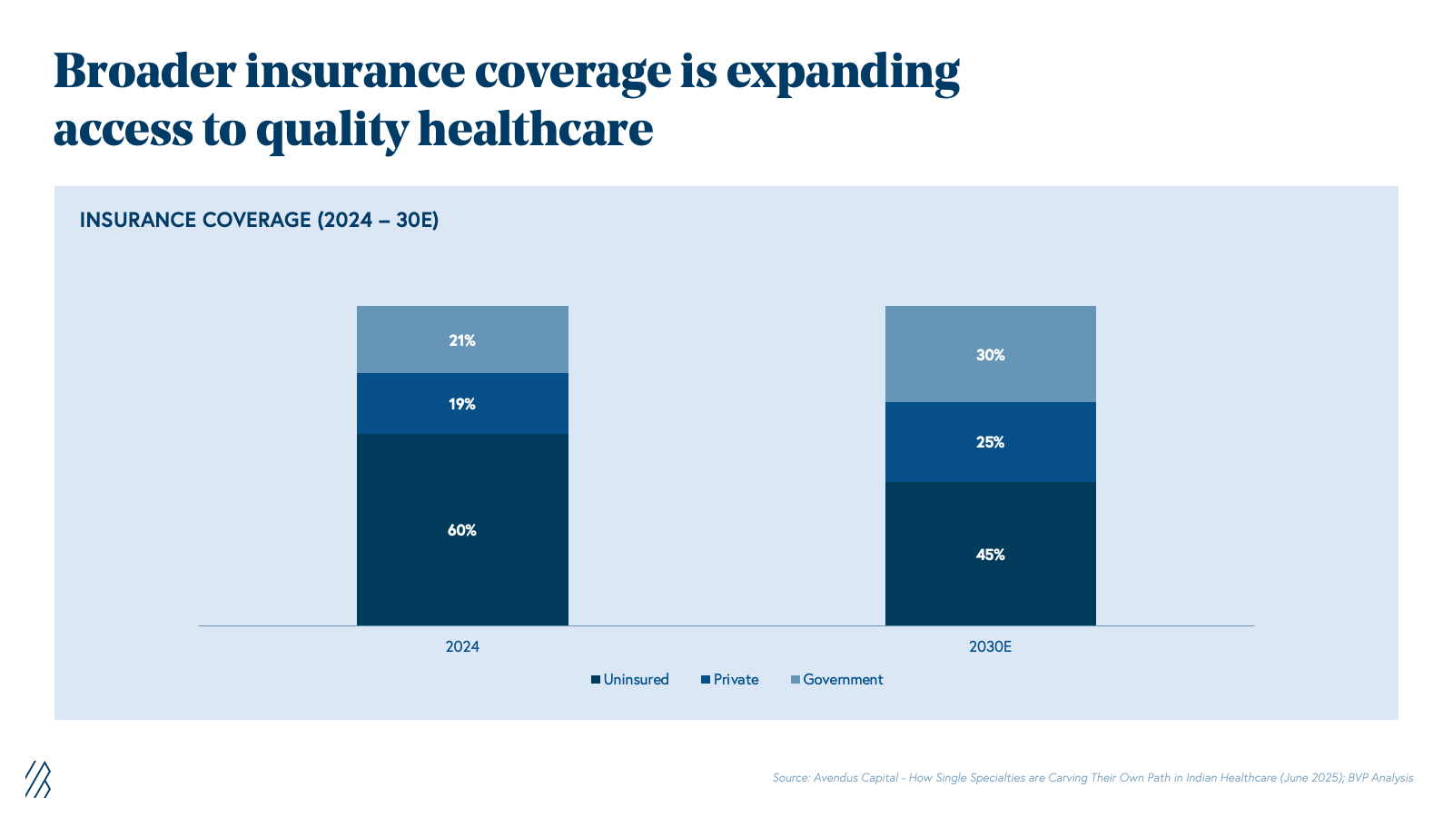 - From metro-centric care to scalable specialty networks: Specialty care remains metro-centric. Tier 2/3 cities remain reliant on inconsistent local providers, creating an opportunity for single-specialty brands to scale with standardized care protocols and repeatable, hub-and-spoke operations.