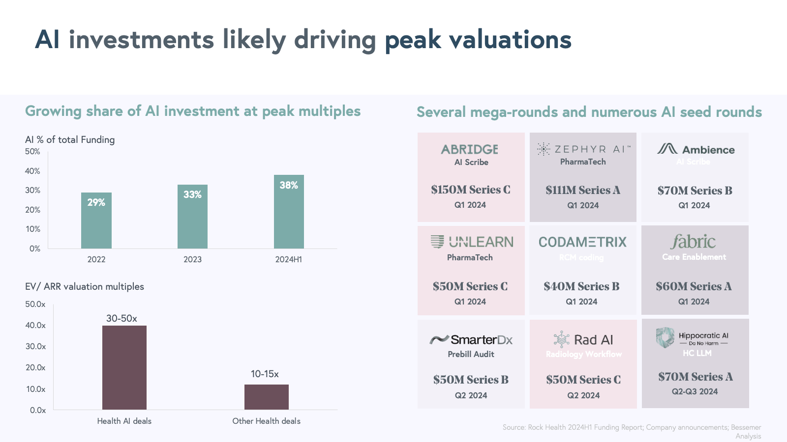 The influence of artificial intelligence on health tech investments cannot be overstated: the share of health tech dollars invested in AI-focused companies has increased by nine percentage points in just two years, reaching 38% in 2024 to date. At 30-50x EV/ARR multiples, the valuations that some of these AI companies are commanding can range 2-5x higher than their non-AI counterparts. These high valuation multiples showcase the private market excitement for new business models, market, and technology category creation.