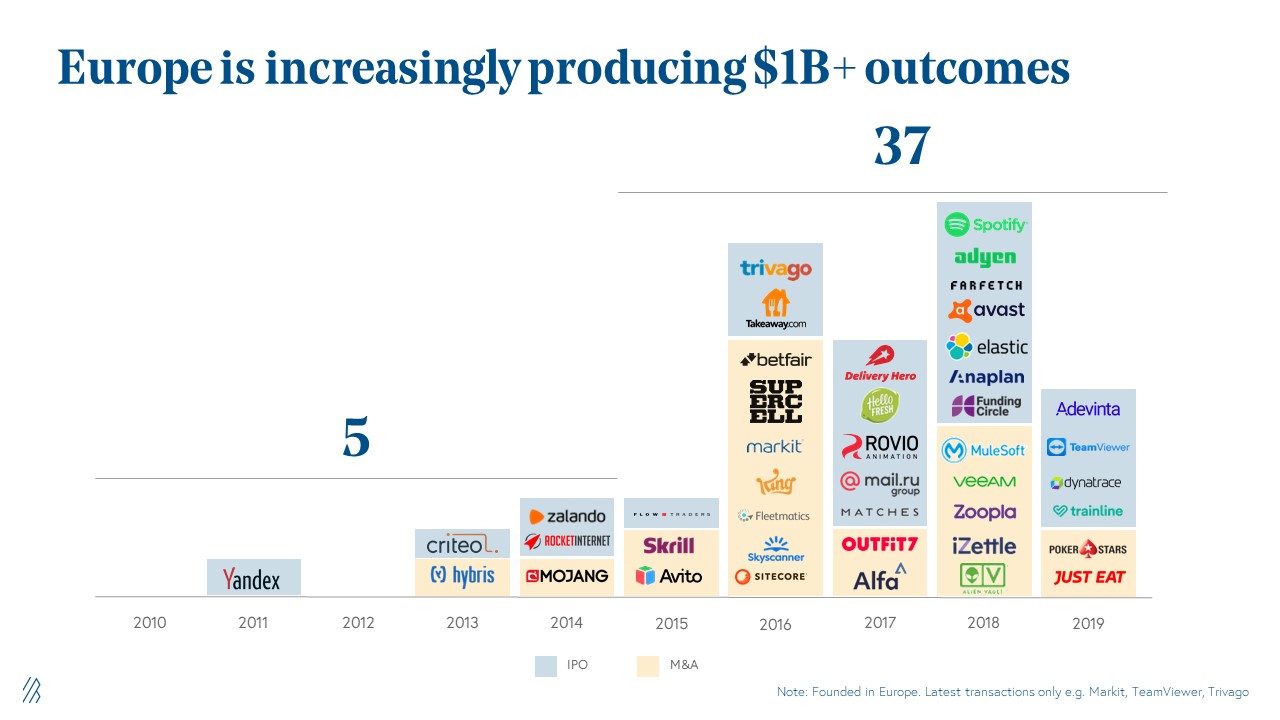 - The exit environment has been consistently producing billion-dollar exits. From 2010 to 2014, the region only saw a total of five IPO and M&As, all valued at a billion dollars or more. Since 2015, that number has increased more than 7x with 37 total exits from companies such as Trivago, MuleSoft, Spotify, Adyen, Elastic, Anaplan, TeamViewer, and more.