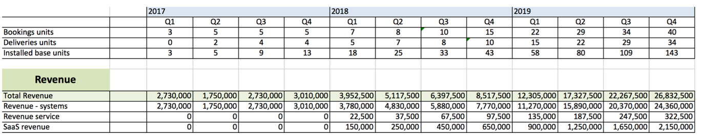 Velo3D is still iterating on their pricing strategy. They believe they can build a machine for $350K (based mostly on COGS of existing printers) and sell it for $700K as their competitors do. To extract a premium for the support-less feature, they hope to add a $200K annual recurring SaaS fee for use of their processing cloud to turn CAD models into instructions for their machine (it’s a computationally expensive operation). Using these assumptions, they plan to sell $10M, $24M, and $79M in 2017, 2018, and 2019 at close to a 60% gross margin, achieving 5% market share in metal 3D printers: